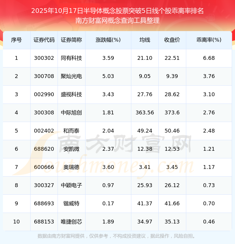 根據(jù)南方財(cái)富網(wǎng)概念查詢工具數(shù)據(jù)統(tǒng)計(jì),截止2025年10月17日收盤,半導(dǎo)體概念股票共有12只個(gè)股收盤價(jià)向上突破了5日線。其中乖離率較大的個(gè)股有同有科技、聚燦光電、盛視科技等,乖離率分別為6.68%、3.76%、3.10%。