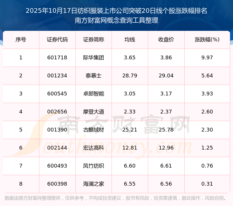 根據南方財富網概念查詢工具數據統(tǒng)計,截止2025年10月17日收盤,紡織服裝上市公司共有8只個股收盤價向上突破了20日線。其中漲幅較大的個股有際華集團、泰慕士、卓郎智能等,漲幅分別為9.97%、5.64%、3.93%。