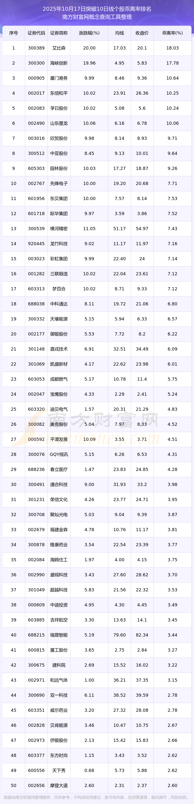 2025年10月17日突破10日線個(gè)股乖離率排名