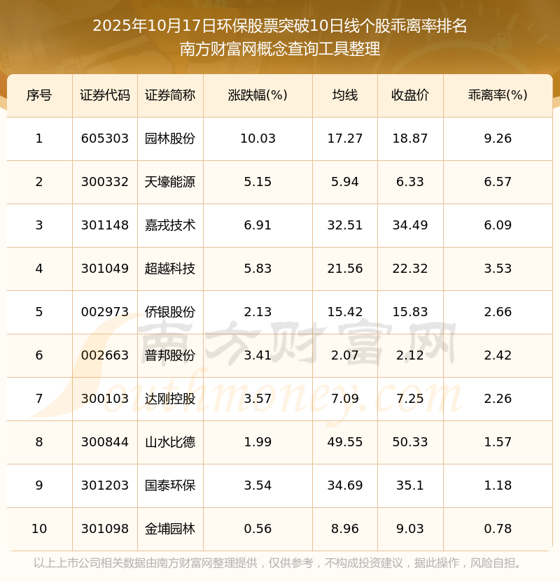 2025年10月17日環(huán)保股票突破10日線個(gè)股乖離率排名