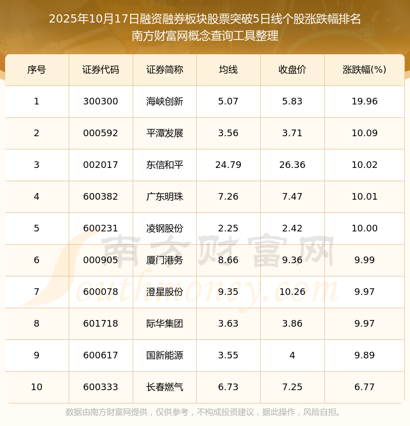 2025年10月17日融資融券板塊股票突破5日線個(gè)股漲跌幅排名