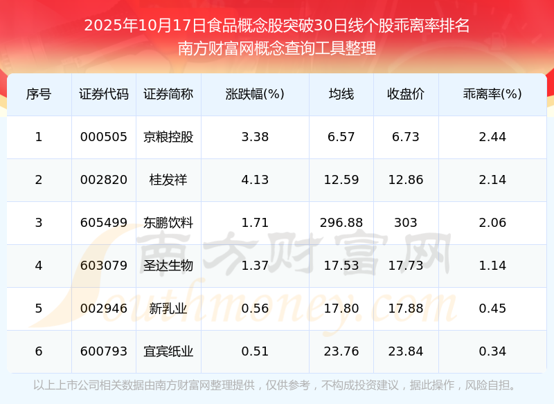 根據(jù)南方財富網(wǎng)概念查詢工具數(shù)據(jù)統(tǒng)計,截止2025年10月17日收盤,食品概念股共有6只個股收盤價向上突破了30日線。其中乖離率較大的個股有京糧控股、桂發(fā)祥、東鵬飲料等,乖離率分別為2.44%、2.14%、2.06%。