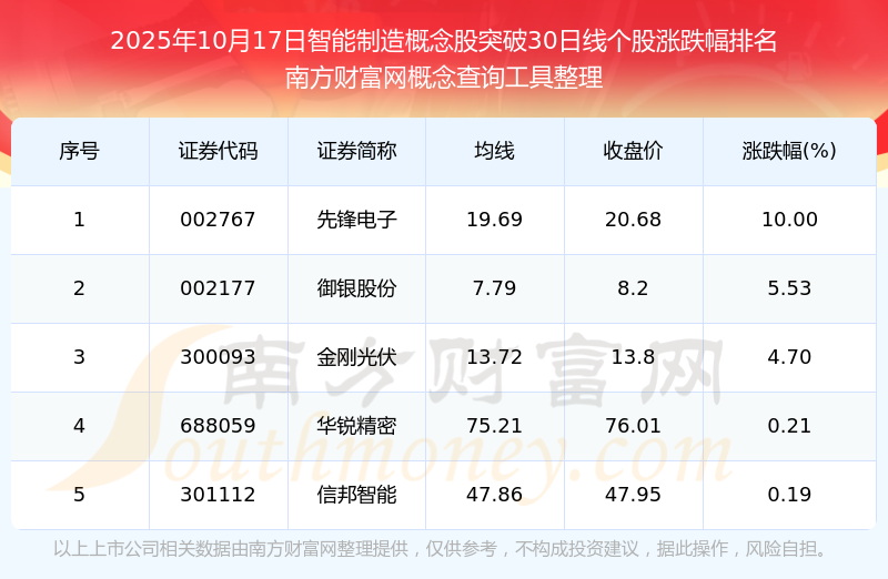 根據(jù)南方財富網(wǎng)概念查詢工具數(shù)據(jù)統(tǒng)計,截止2025年10月17日收盤,智能制造概念股共有5只個股收盤價向上突破了30日線。其中漲幅較大的個股有先鋒電子、御銀股份、金剛光伏等,漲幅分別為10.00%、5.53%、4.70%。