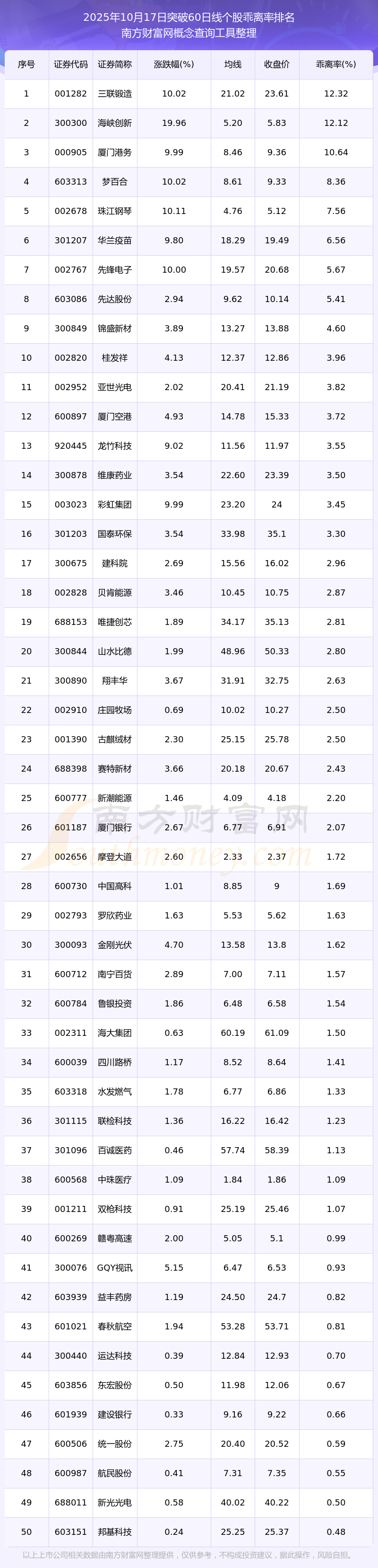 2025年10月17日突破60日線個(gè)股乖離率排名