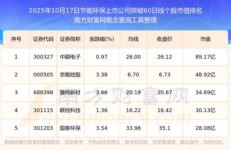 2025年10月17日節(jié)能環(huán)保上市公司突破60日線個股市值排名