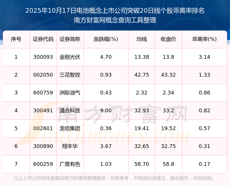 2025年10月17日電池概念上市公司突破20日線個(gè)股乖離率排名