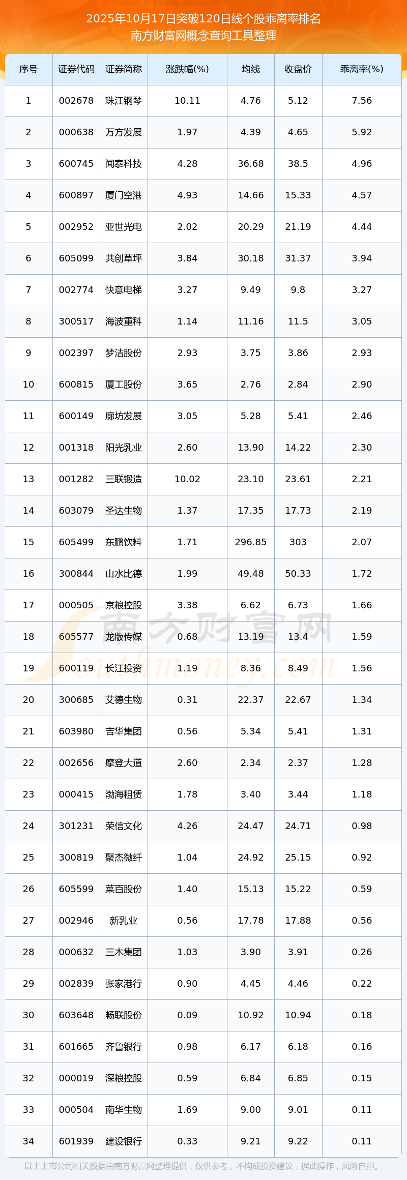 2025年10月17日突破半年線個(gè)股乖離率排名
