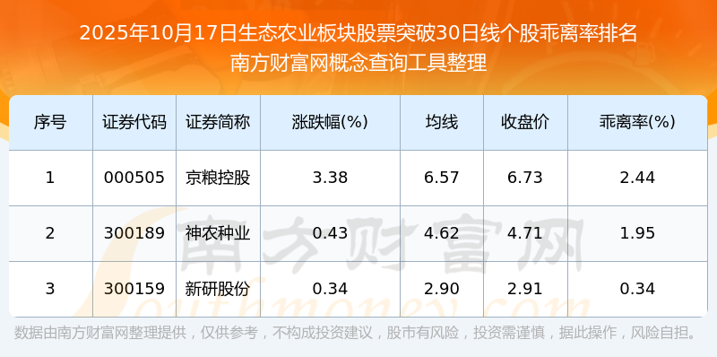 2025年10月17日生態(tài)農(nóng)業(yè)板塊股票突破30日線個(gè)股乖離率排名