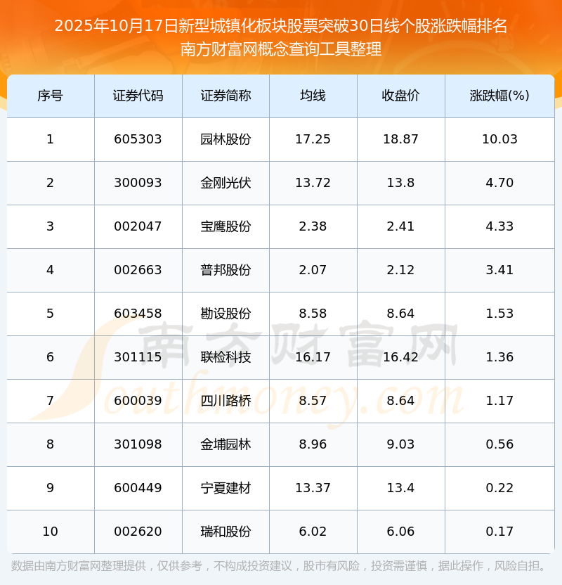 2025年10月17日新型城鎮(zhèn)化板塊股票突破30日線個股漲跌幅排名