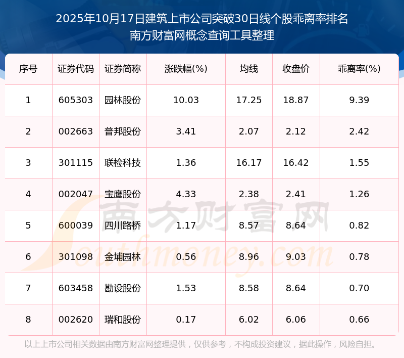 2025年10月17日建筑上市公司突破30日線個(gè)股乖離率排名