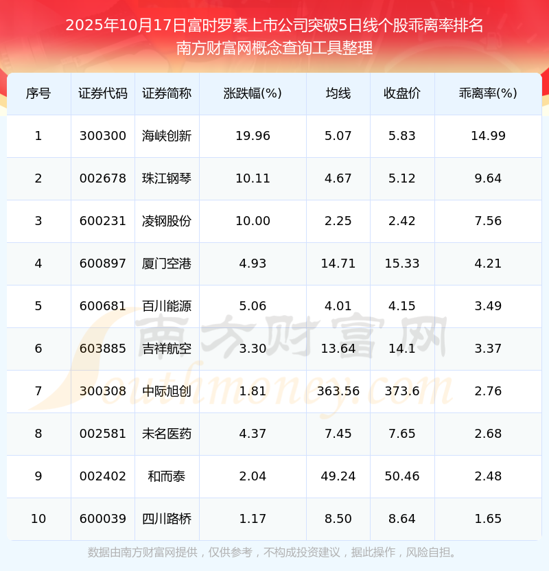 2025年10月17日富時(shí)羅素上市公司突破5日線個(gè)股乖離率排名