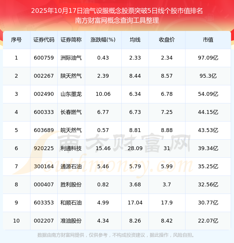 2025年10月17日油氣設服概念股票突破5日線個股市值排名