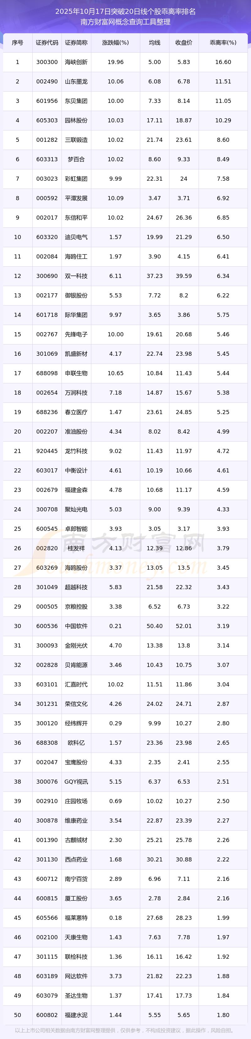2025年10月17日突破20日線個(gè)股乖離率排名