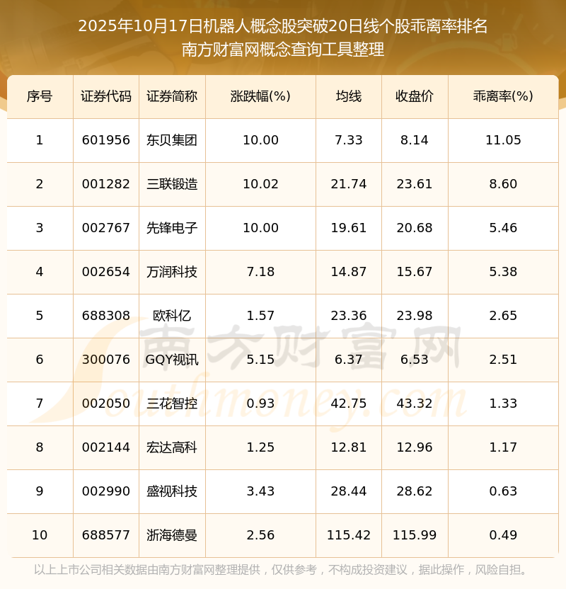 根據南方財富網概念查詢工具數據統(tǒng)計,截止2025年10月17日收盤,機器人概念股共有14只個股收盤價向上突破了20日線。其中乖離率較大的個股有東貝集團、三聯(lián)鍛造、先鋒電子等,乖離率分別為11.05%、8.60%、5.46%。