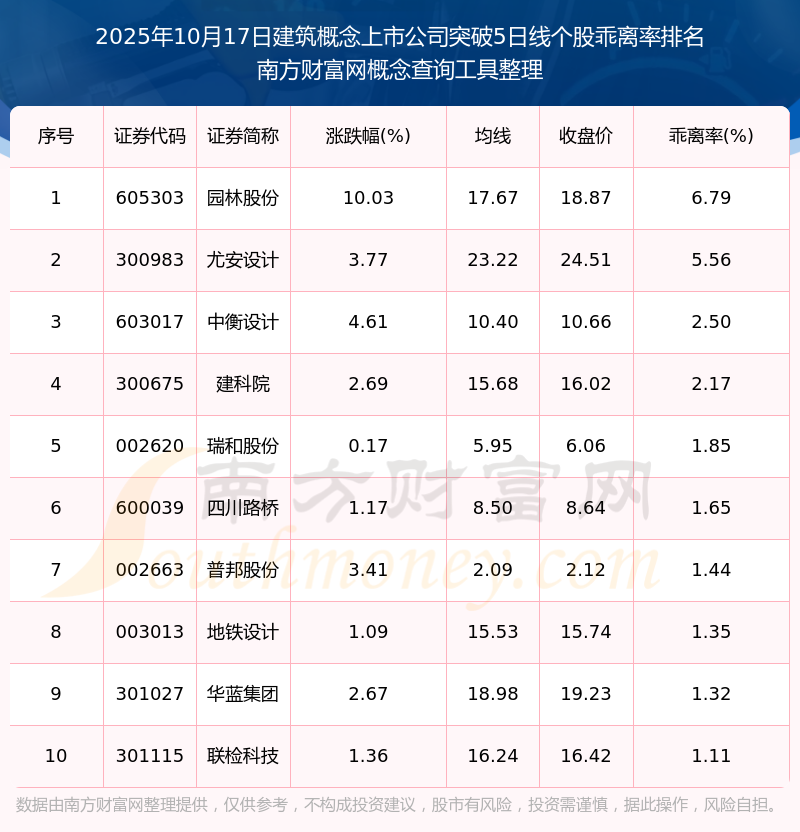 2025年10月17日建筑概念上市公司突破5日線個(gè)股乖離率排名