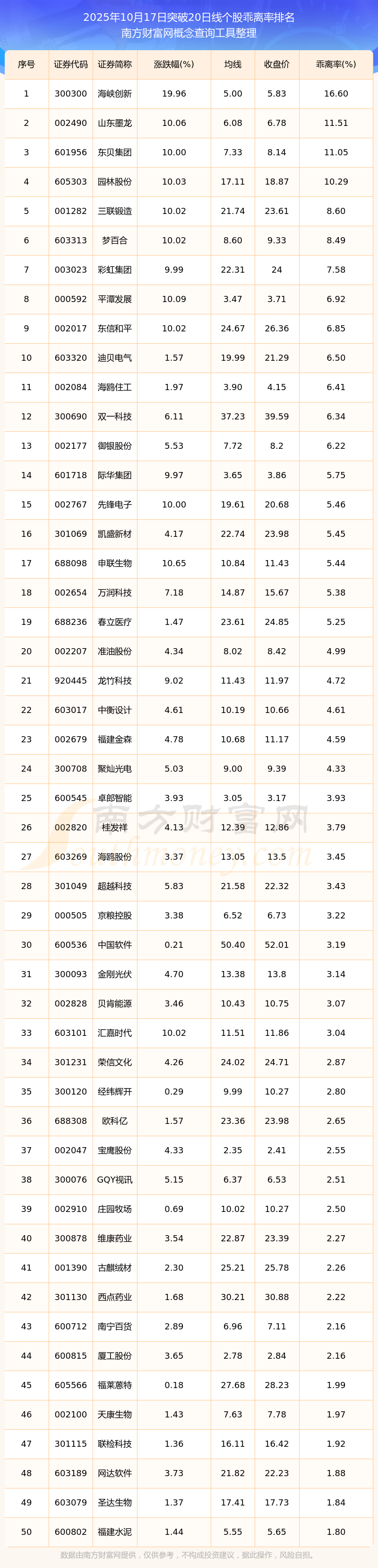 根據(jù)南方財富網(wǎng)概念查詢工具數(shù)據(jù)統(tǒng)計,截止2025年10月17日收盤,共有108只個股收盤價向上突破了20日線,其中乖離率較大的個股有海峽創(chuàng)新、山東墨龍、東貝集團、園林股份、三聯(lián)鍛造等,乖離率分別為16.60%、11.51%、11.05%、10.29%、8.60%。