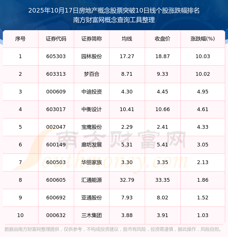 2025年10月17日房地產(chǎn)概念股票突破10日線個股漲跌幅排名