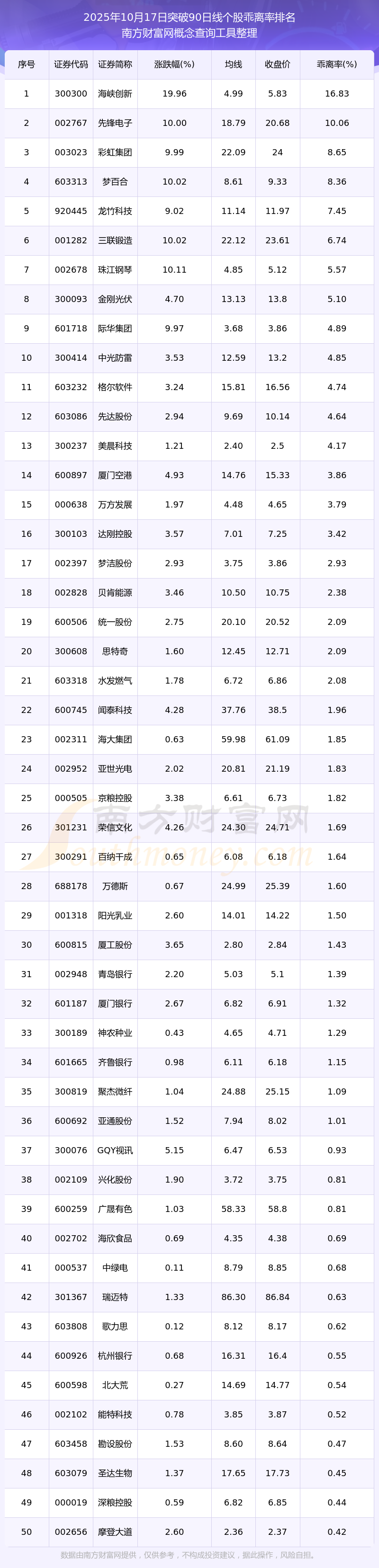 2025年10月17日突破90日線個(gè)股乖離率排名