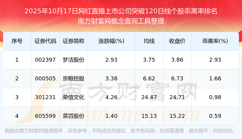 2025年10月17日網(wǎng)紅直播上市公司突破120日線個股乖離率排名