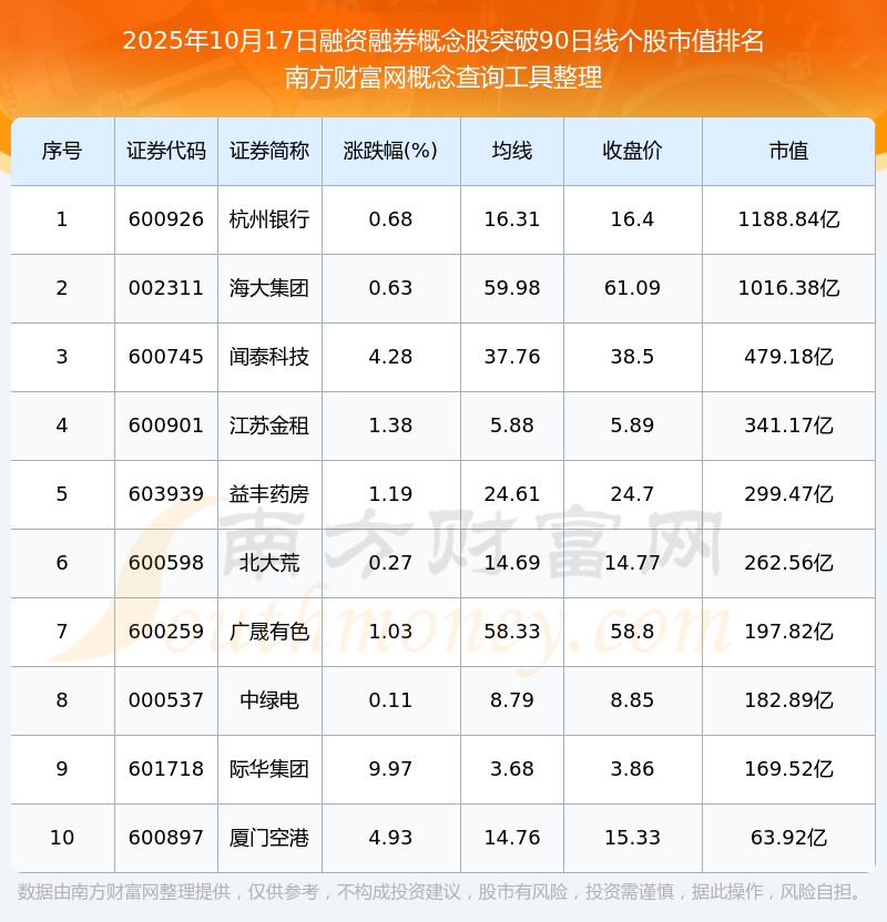 2025年10月17日融資融券概念股突破90日線個(gè)股市值排名