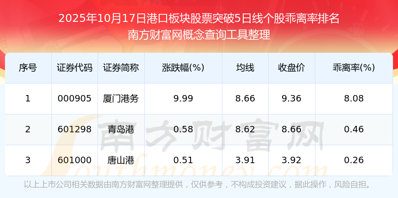 2025年10月17日港口板塊股票突破5日線個股乖離率排名