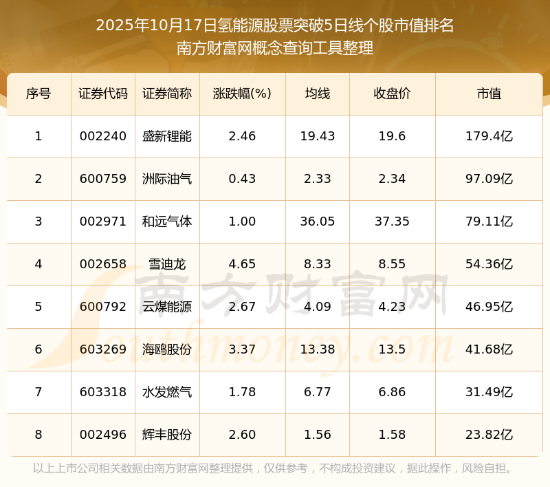 2025年10月17日氫能源股票突破5日線個(gè)股市值排名