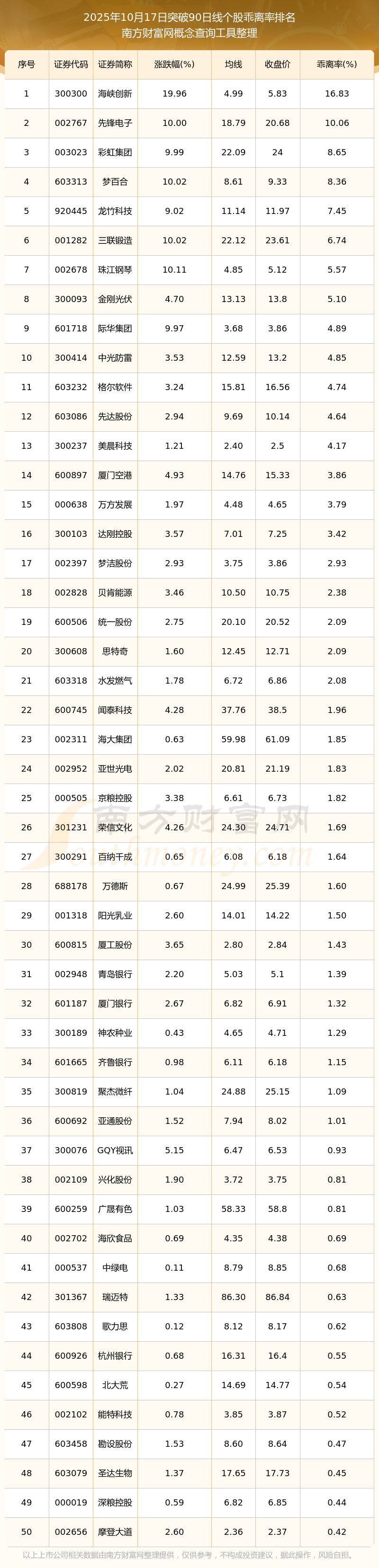 2025年10月17日突破90日線個(gè)股乖離率排名