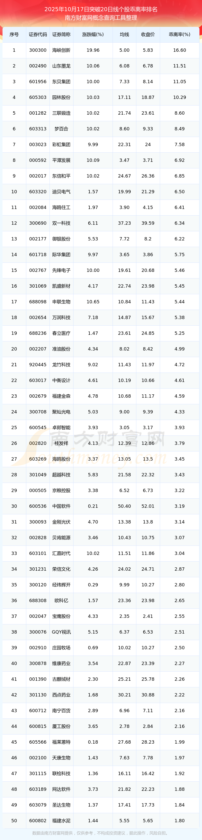 根據(jù)南方財富網(wǎng)概念查詢工具數(shù)據(jù)統(tǒng)計,截止2025年10月17日收盤,共有108只個股收盤價向上突破了20日線,其中乖離率較大的個股有海峽創(chuàng)新、山東墨龍、東貝集團、園林股份、三聯(lián)鍛造等,乖離率分別為16.60%、11.51%、11.05%、10.29%、8.60%。