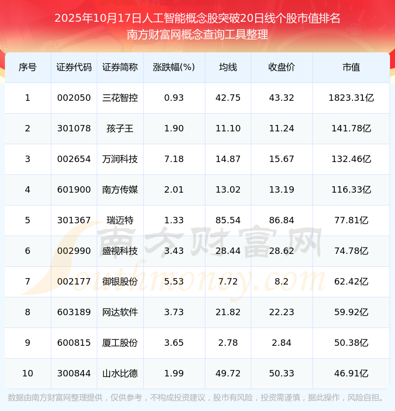 2025年10月17日人工智能概念股突破20日線個(gè)股市值排名