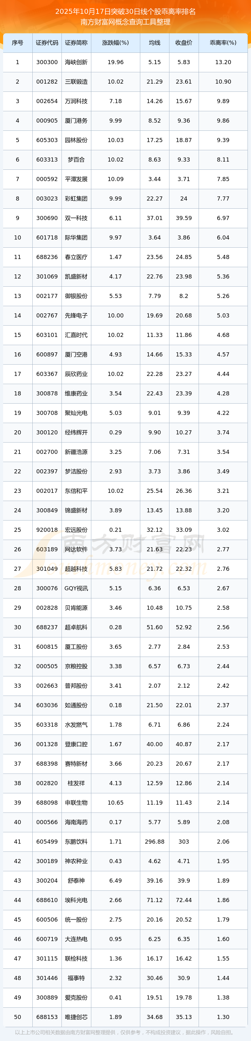 2025年10月17日突破30日線個(gè)股乖離率排名