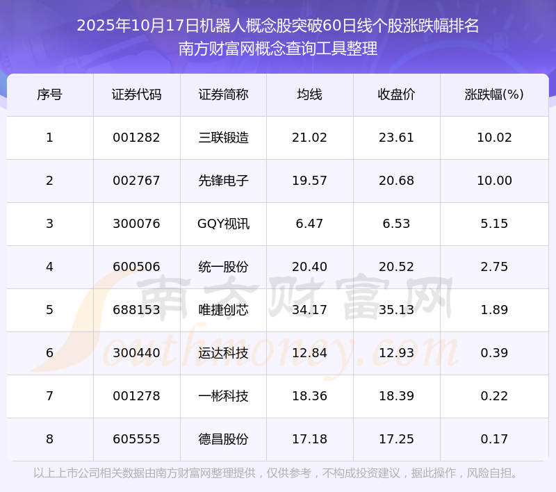 2025年10月17日機(jī)器人概念股突破60日線個(gè)股漲跌幅排名
