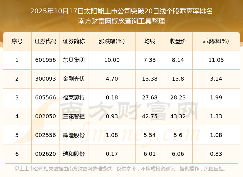 根據(jù)南方財富網(wǎng)概念查詢工具數(shù)據(jù)統(tǒng)計,截止2025年10月17日收盤,太陽能上市公司共有6只個股收盤價向上突破了20日線。其中乖離率較大的個股有東貝集團、金剛光伏、福萊蒽特等,乖離率分別為11.05%、3.14%、1.99%。