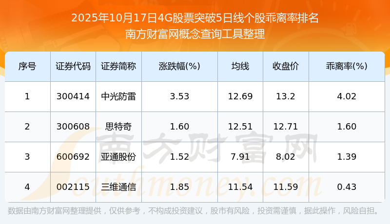 根據(jù)南方財富網(wǎng)概念查詢工具數(shù)據(jù)統(tǒng)計,截止2025年10月17日收盤,4G股票共有4只個股收盤價向上突破了5日線。其中乖離率較大的個股有中光防雷、思特奇、亞通股份等,乖離率分別為4.02%、1.60%、1.39%。