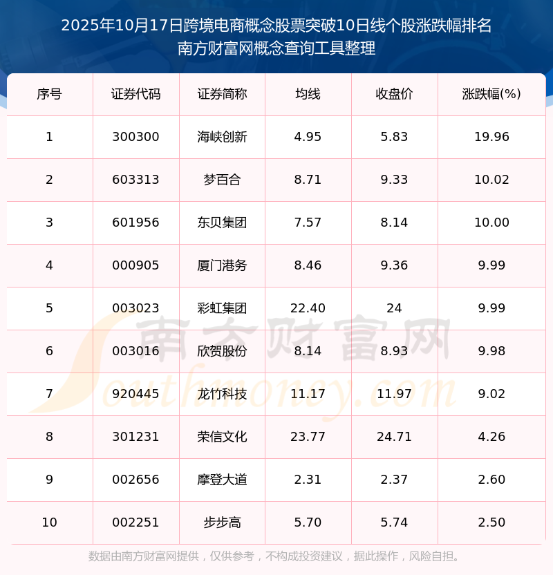 2025年10月17日跨境電商概念股票突破10日線個股漲跌幅排名