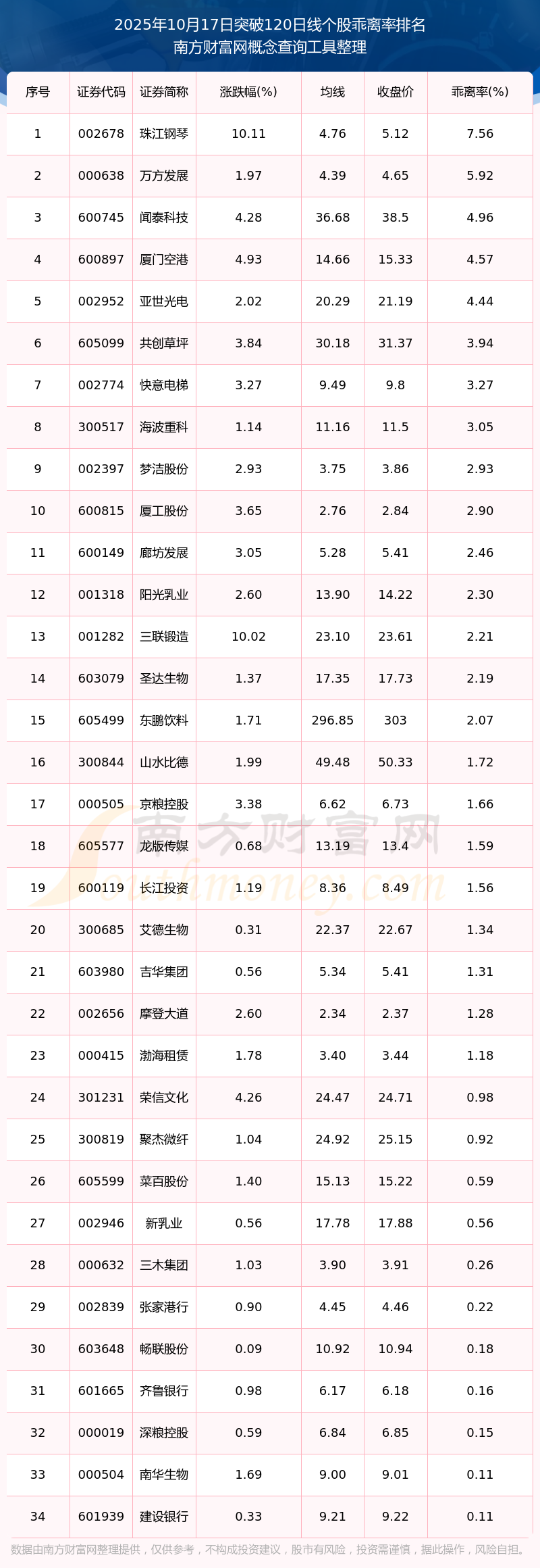2025年10月17日突破半年線個(gè)股乖離率排名