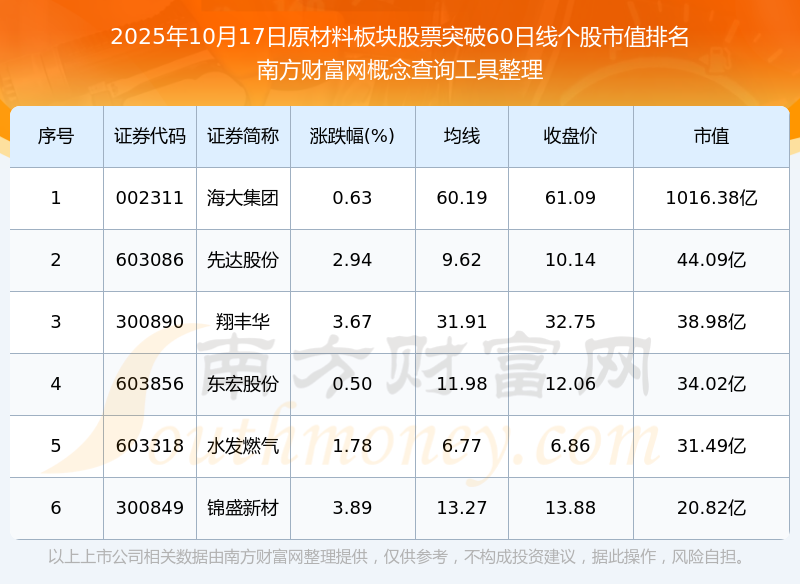 根據(jù)南方財(cái)富網(wǎng)概念查詢工具數(shù)據(jù)統(tǒng)計(jì),截止2025年10月17日收盤,原材料板塊股票共有6只個(gè)股收盤價(jià)向上突破了60日線。其中市值較大的個(gè)股有海大集團(tuán)、先達(dá)股份、翔豐華等,市值分別為1016.38億、44.09億、38.98億。