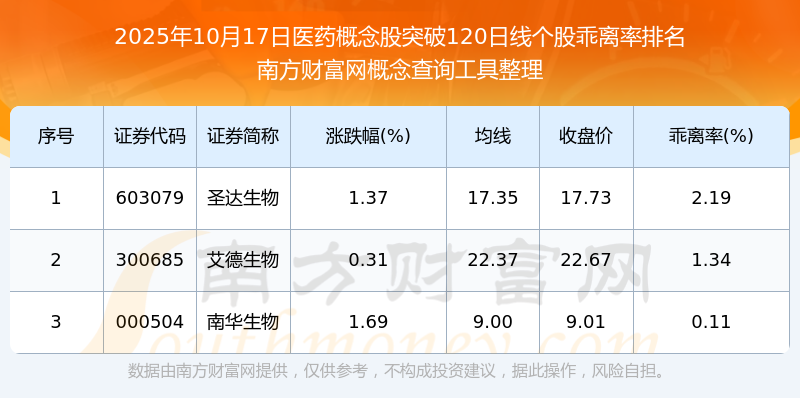 根據南方財富網概念查詢工具數據統計,截止2025年10月17日收盤,醫(yī)藥概念股共有3只個股收盤價向上突破了120日線。其中乖離率較大的個股有圣達生物、艾德生物、南華生物等,乖離率分別為2.19%、1.34%、0.11%。