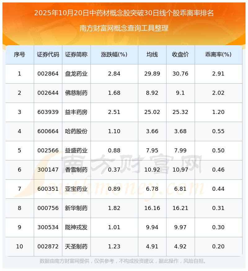 2025年10月20日中藥材概念股突破30日線個(gè)股乖離率排名
