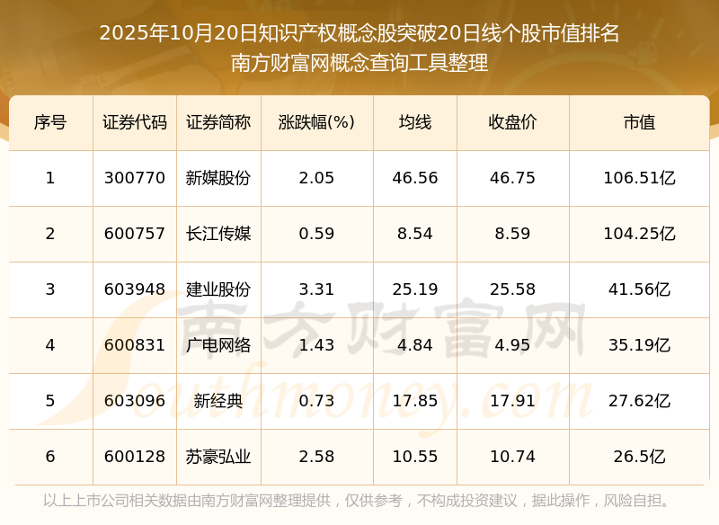 根據(jù)南方財富網(wǎng)概念查詢工具數(shù)據(jù)統(tǒng)計,截止2025年10月20日收盤,知識產(chǎn)權(quán)概念股共有6只個股收盤價向上突破了20日線。其中市值較大的個股有新媒股份、長江傳媒、建業(yè)股份等,市值分別為106.51億、104.25億、41.56億。