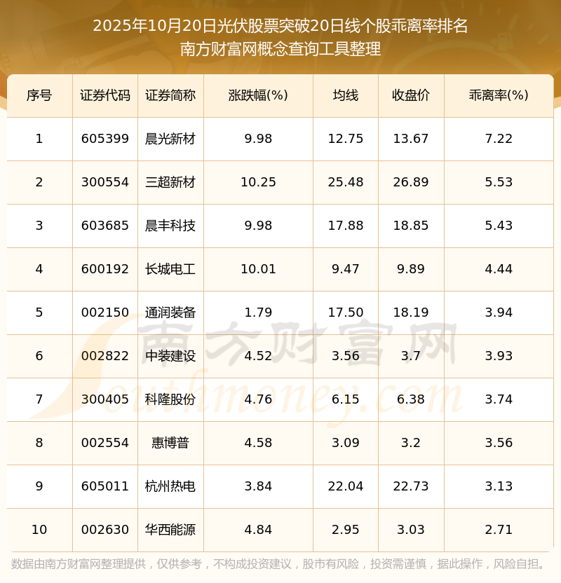 根據(jù)南方財(cái)富網(wǎng)概念查詢工具數(shù)據(jù)統(tǒng)計(jì),截止2025年10月20日收盤,光伏股票共有60只個(gè)股收盤價(jià)向上突破了20日線。其中乖離率較大的個(gè)股有晨光新材、三超新材、晨豐科技等,乖離率分別為7.22%、5.53%、5.43%。