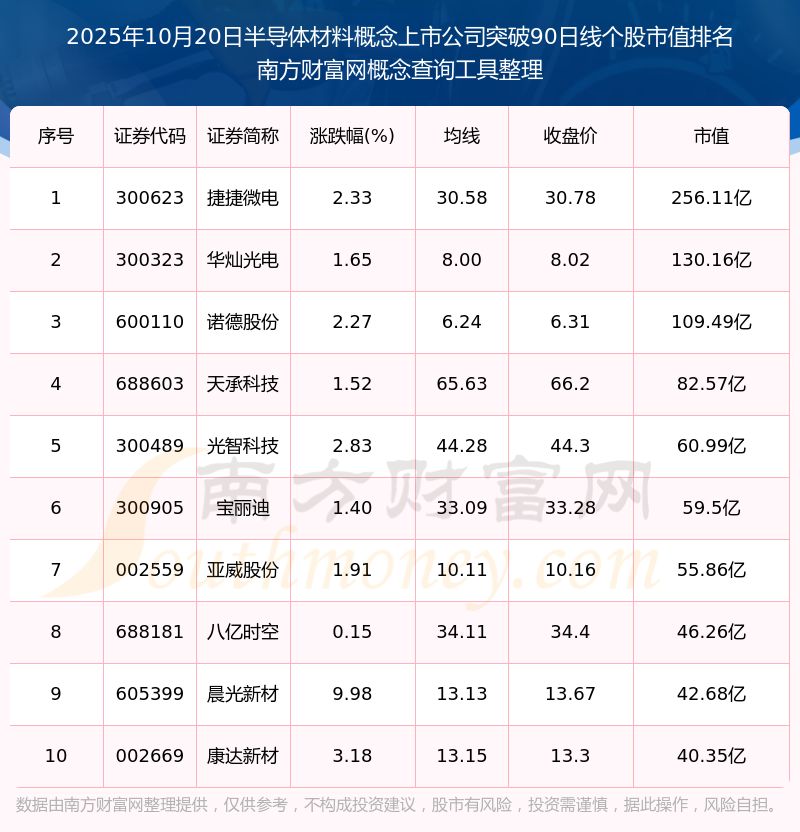 2025年10月20日半導(dǎo)體材料概念上市公司突破90日線個(gè)股市值排名