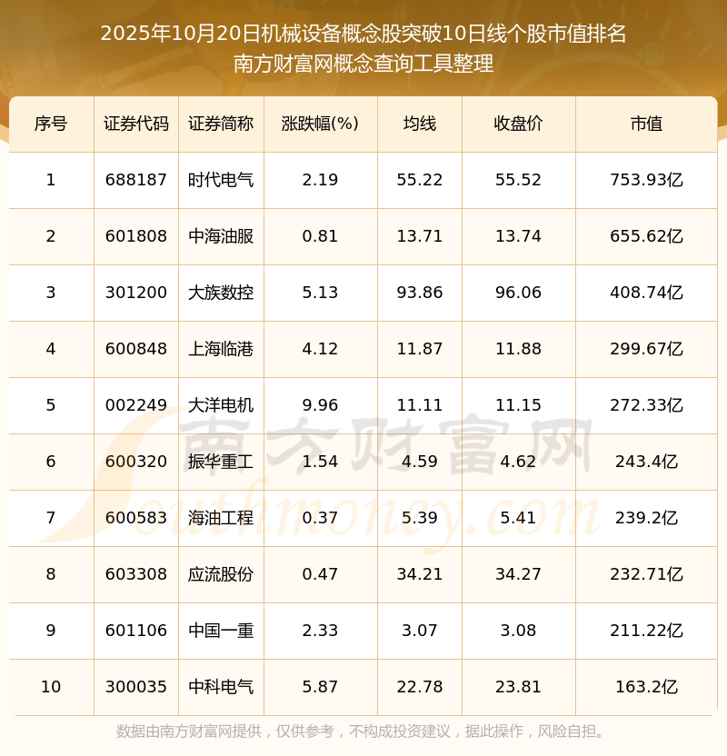 2025年10月20日機械設(shè)備概念股突破10日線個股市值排名