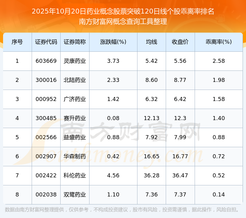 2025年10月20日藥業(yè)概念股票突破120日線個(gè)股乖離率排名