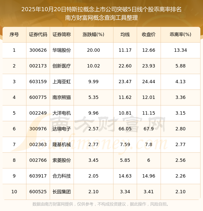 2025年10月20日特斯拉概念上市公司突破5日線個(gè)股乖離率排名