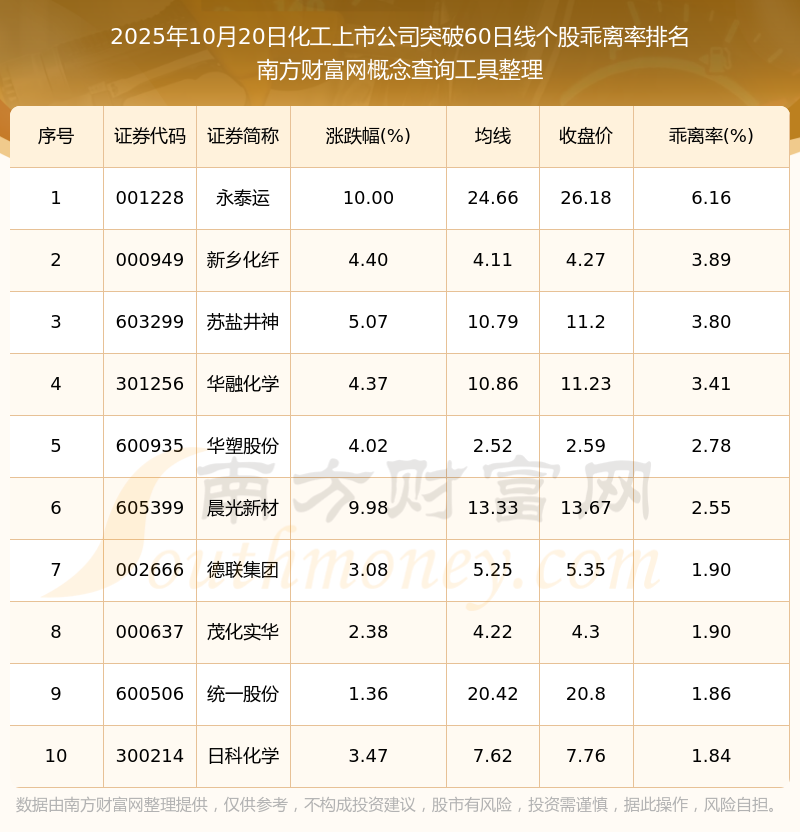 2025年10月20日化工上市公司突破60日線個(gè)股乖離率排名