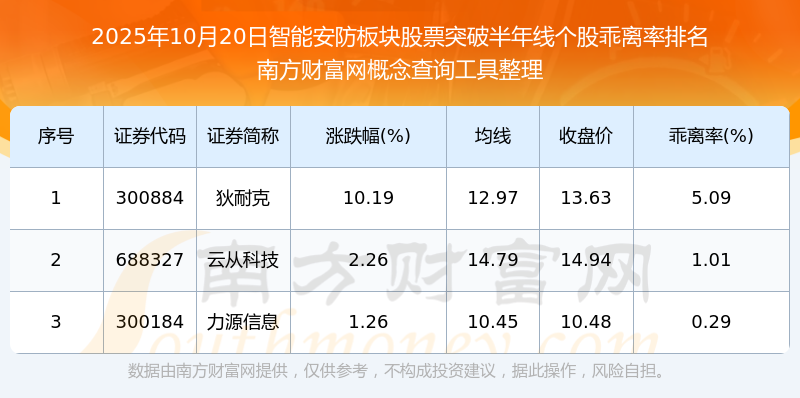2025年10月20日智能安防板塊股票突破半年線個(gè)股乖離率排名