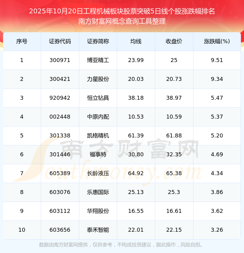 2025年10月20日工程機械板塊股票突破5日線個股漲跌幅排名