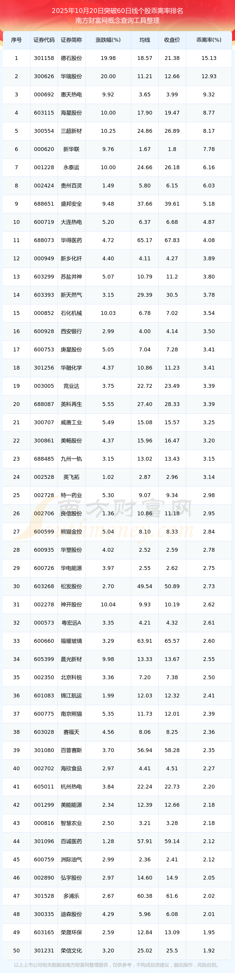 根據(jù)南方財富網(wǎng)概念查詢工具數(shù)據(jù)統(tǒng)計,截止2025年10月20日收盤,共有251只個股收盤價向上突破了60日線,其中乖離率較大的個股有德石股份、華瑞股份、惠天熱電、海星股份、三超新材等,乖離率分別為15.13%、12.93%、9.32%、8.77%、8.17%。