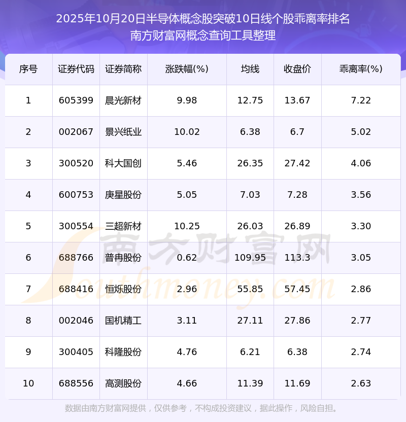 2025年10月20日半導(dǎo)體概念股突破10日線個(gè)股乖離率排名