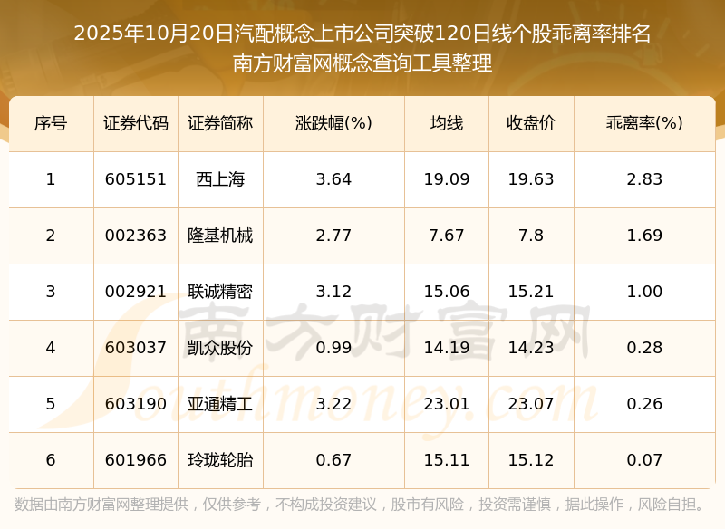 根據(jù)南方財(cái)富網(wǎng)概念查詢工具數(shù)據(jù)統(tǒng)計(jì),截止2025年10月20日收盤,汽配概念上市公司共有6只個(gè)股收盤價(jià)向上突破了120日線。其中乖離率較大的個(gè)股有西上海、隆基機(jī)械、聯(lián)誠(chéng)精密等,乖離率分別為2.83%、1.69%、1.00%。